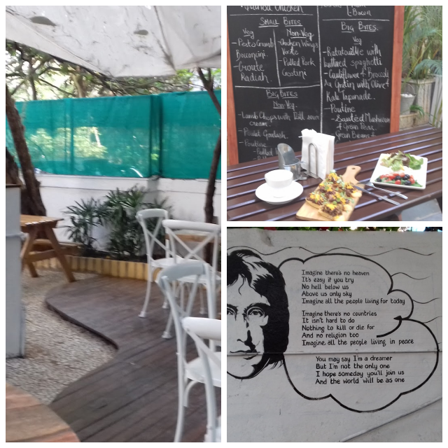 a very nice open garden cafe.quiet as it is in a lane next to malaca spice in lane 5 in koregaon park..parking is a problem as it is the last bungalow in the small lane..limited menu but good dishes.had pulled pork.tuna salad.potatoe&leak soup..very gd coffee and superb desserts...very gd value for money as all items reasonabley priced..